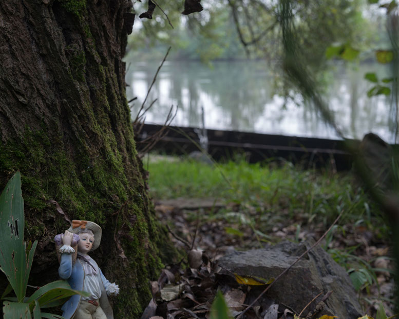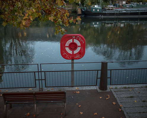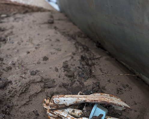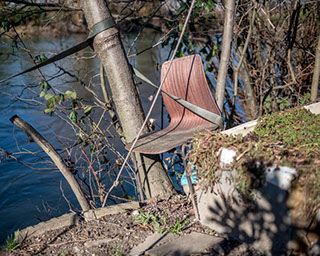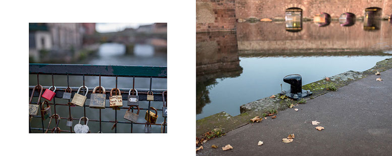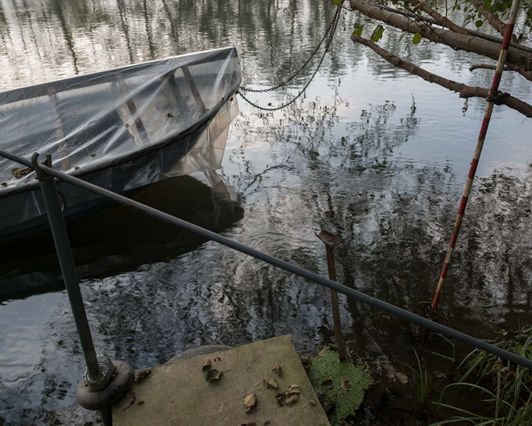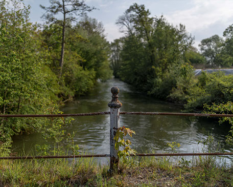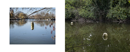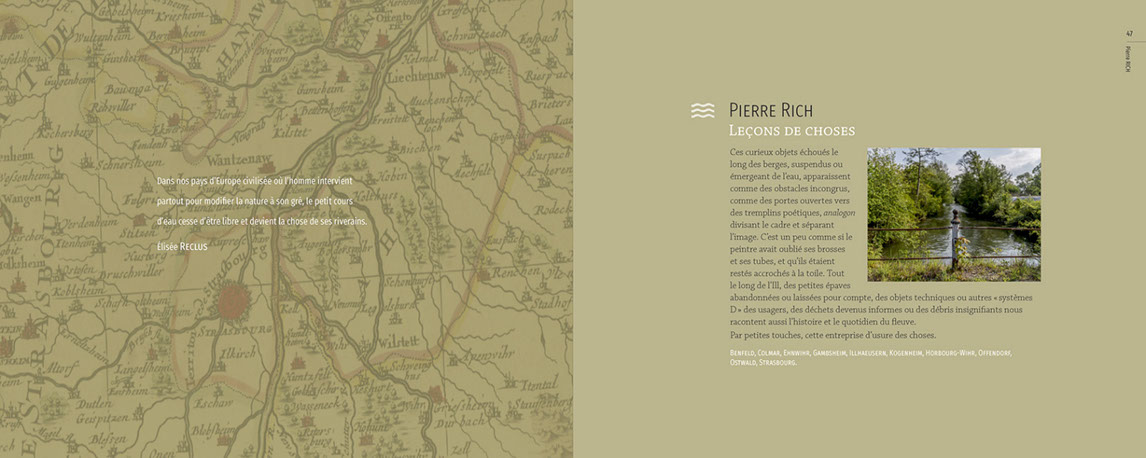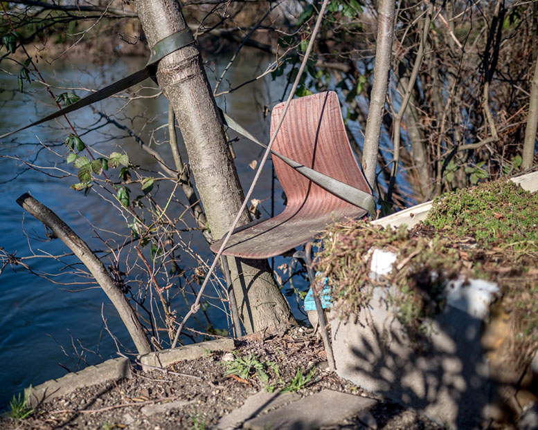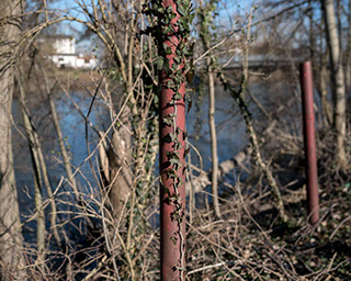 Ces curieux objets échoués le long des berges, suspendus ou émergeant de l’eau, apparaissent comme des obstacles incongrus, comme des portes ouvertes vers des tremplins poétiques, divisant le cadre, séparant l’image. C’est un peu comme si le peintre avait oublié ses brosses et ses tubes, et qu’ils étaient restés accrochés à la toile. Tout le long de l’Ill, des petites épaves abandonnées ou laissées pour compte, des objets techniques ou autres « systèmes D » des usagers, des déchets devenus informes ou des débris insignifiants nous racontent aussi l’histoire et le quotidien du fleuve. Par petites touches, cette entreprise d’usure des choses.
