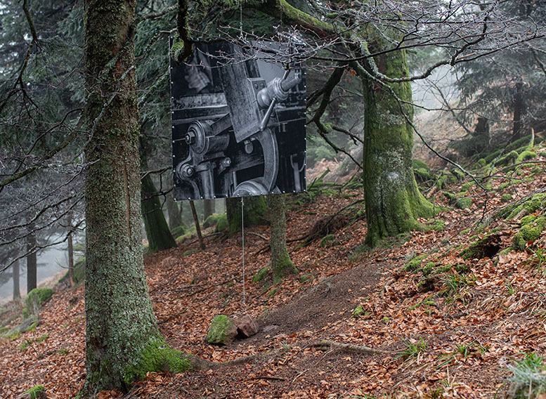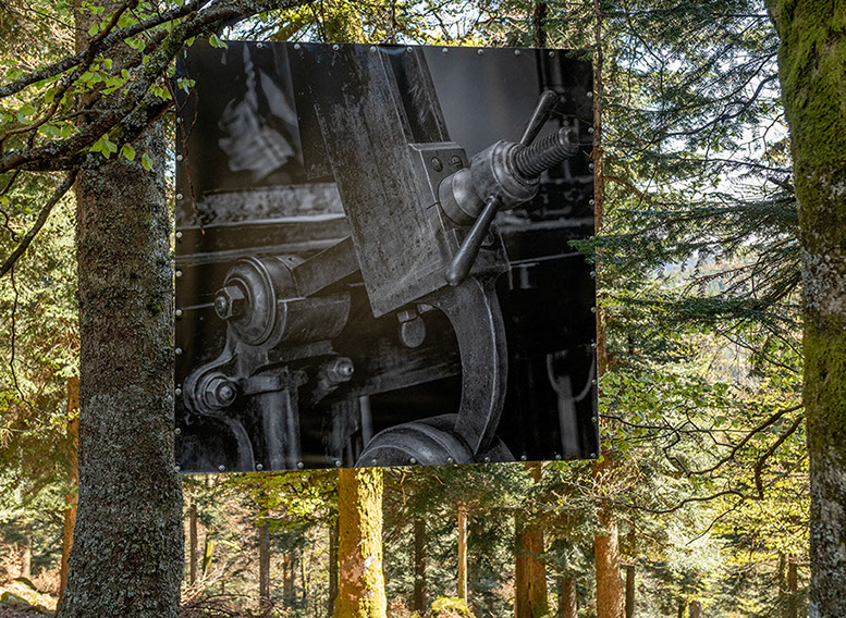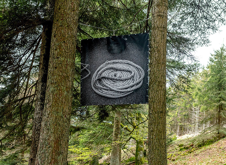 Trois duo d’images imprimées recto verso sur support bâche, câbles, métal, pièce de roulement, 150x150 cm.