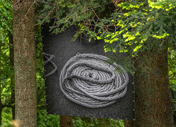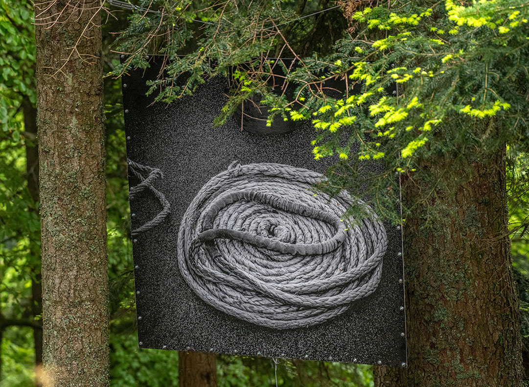 Trois duos d’images imprimées recto verso sur support bâche, câbles, métal, pièce de roulement, 150x150 cm.