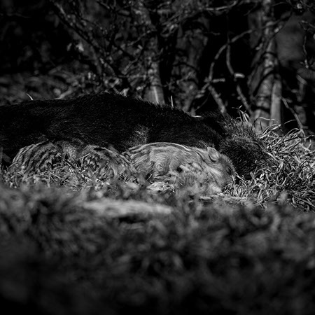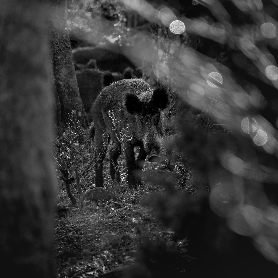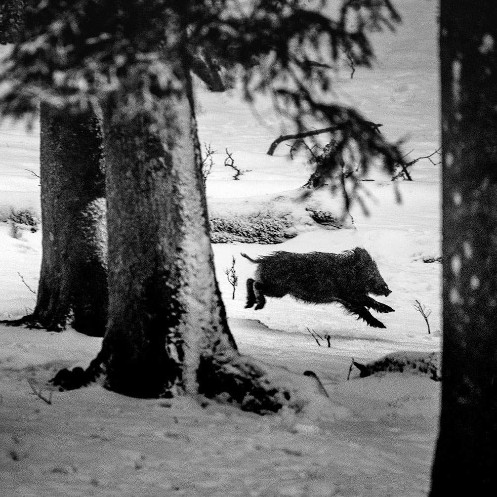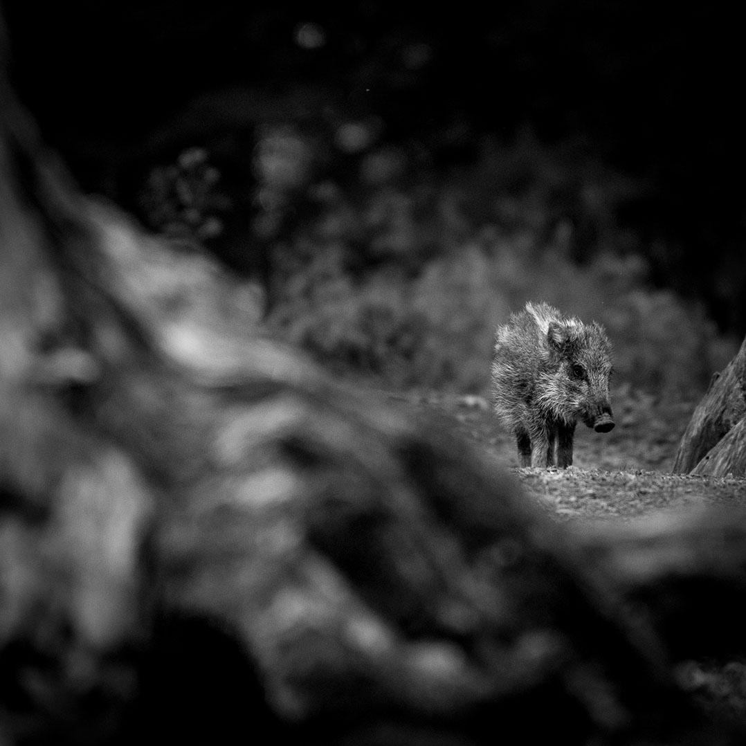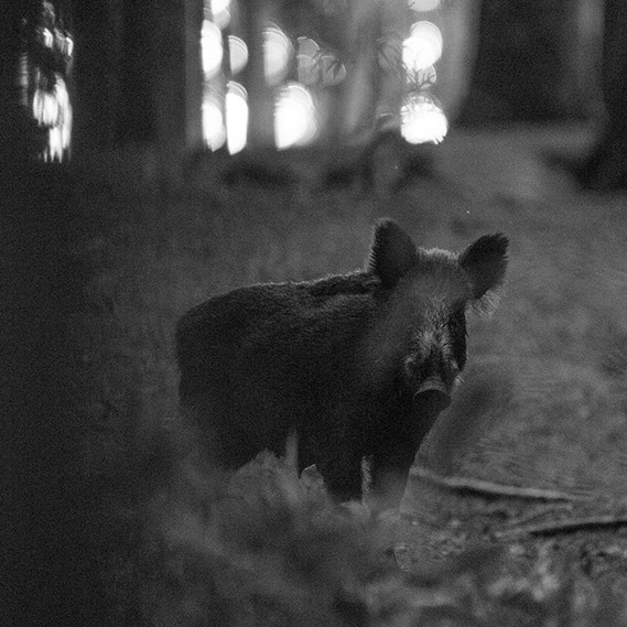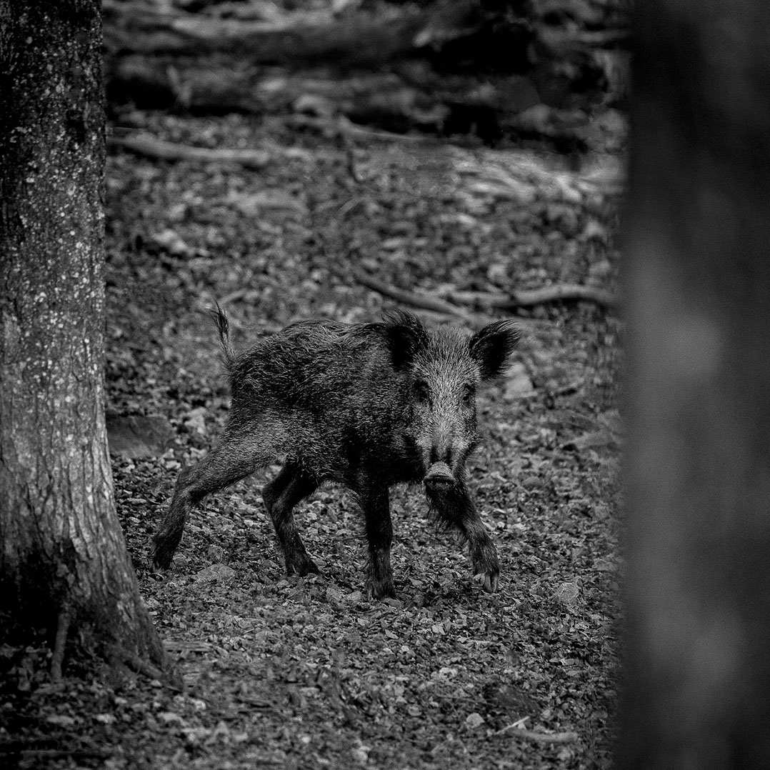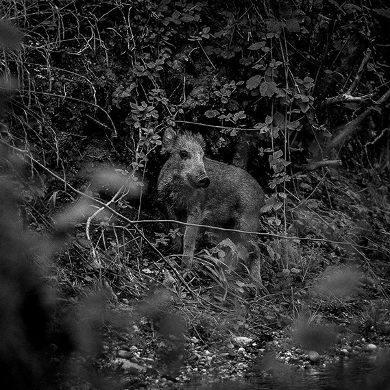 Sus scrofa est le nom latin du sanglier. Ce nom raconte bien, par sa sonorité curieuse, cet animal étrange et si proche de nous, si méprisé et si adulé en même temps. Je l’ai suivi durant deux ans, au fil de mes promenades. Il m’accompagne furtivement, apparaissant sous les taillis, surgissant, effrayé autant que moi, de sa cache secrète. Les images qui en découlent ne sont pas à proprement parler des photos animalières : je les vois plutôt comme des portraits d’animaux singuliers, saisis dans la pleine lumière du bois, attentifs aux moindres bruits, à toutes odeurs passagères. Saisir des animaux dans leur milieu est en effet une expérience totale et fugace. Elle remplit d’une joie étonnante, comme suspendue à l’instant. Derrière les textures et le grain de l’image, où poils et pelages, terres et boues, tronc et hautes herbes se répondent, j’aimerais qu’on puisse entendre aussi les grognements et les petits cris sourds de la bête, que l’on puisse sentir les odeurs terribles et douces du fauve, comprendre aussi les relations étroites que nous entretenons avec la terre, avec notre corps, avec les éléments, nous les « humus-humains » à deux jambes.
