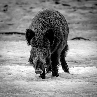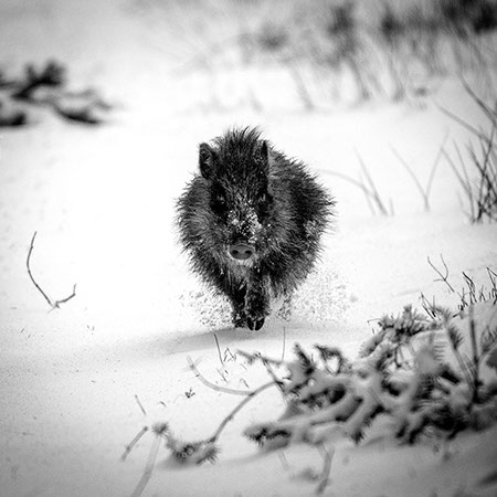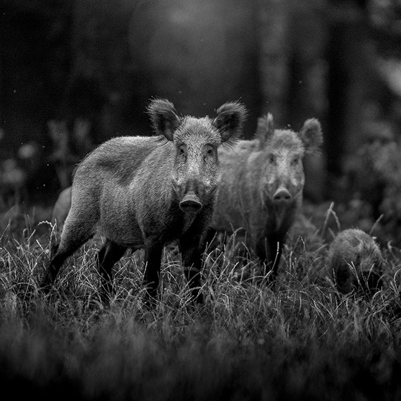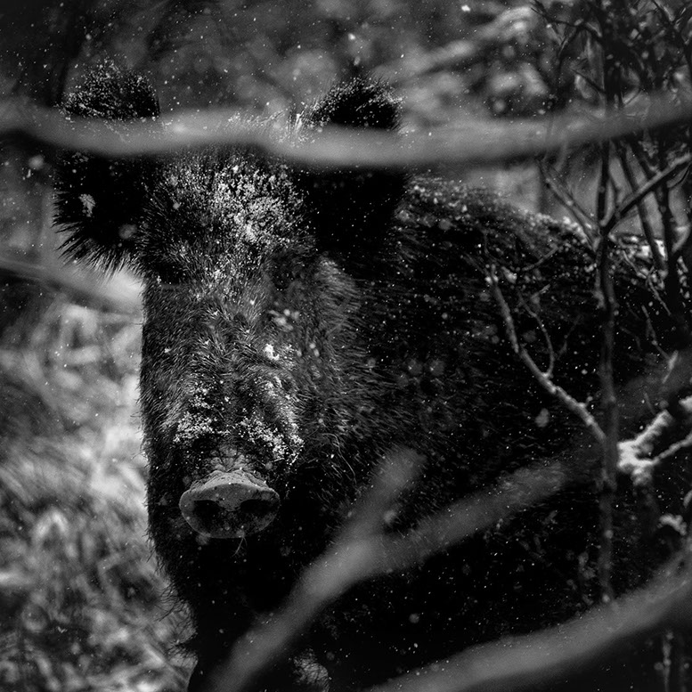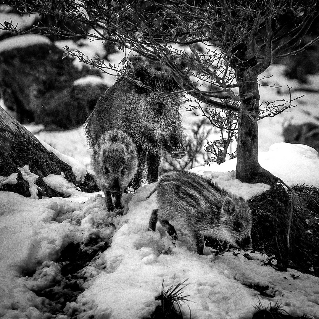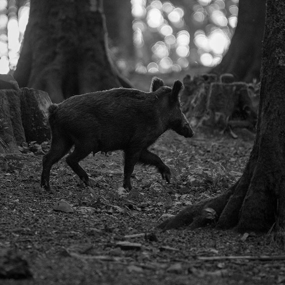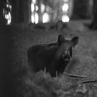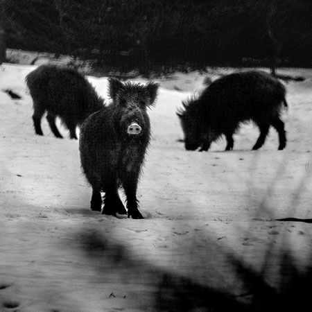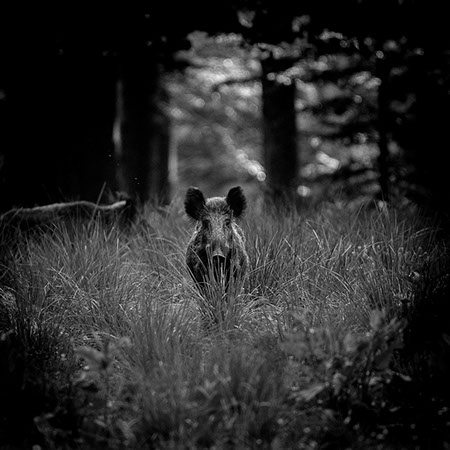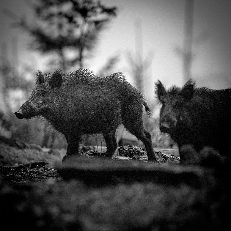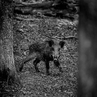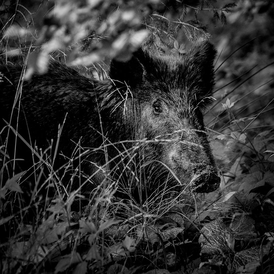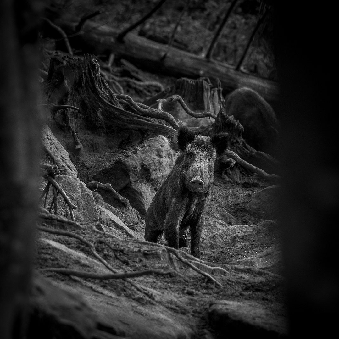 Sus scrofa est le nom latin du sanglier. Ce nom raconte bien, par sa sonorité curieuse, cet animal étrange et si proche de nous, si méprisé et si adulé en même temps. Je l’ai suivi durant deux ans, au fil de mes promenades. Il m’accompagne furtivement, apparaissant sous les taillis, surgissant, effrayé autant que moi, de sa cache secrète. Les images qui en découlent ne sont pas à proprement parler des photos animalières : je les vois plutôt comme des portraits d’animaux singuliers, saisis dans la pleine lumière du bois, attentifs aux moindres bruits, à toutes odeurs passagères. Saisir des animaux dans leur milieu est en effet une expérience totale et fugace. Elle remplit d’une joie étonnante, comme suspendue à l’instant. Derrière les textures et le grain de l’image, où poils et pelages, terres et boues, tronc et hautes herbes se répondent, j’aimerais qu’on puisse entendre aussi les grognements et les petits cris sourds de la bête, que l’on puisse sentir les odeurs terribles et douces du fauve, comprendre aussi les relations étroites que nous entretenons avec la terre, avec notre corps, avec les éléments, nous les « humus-humains » à deux jambes.