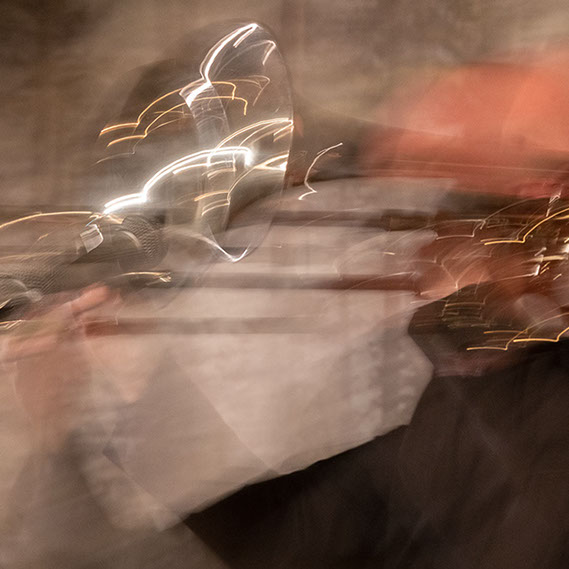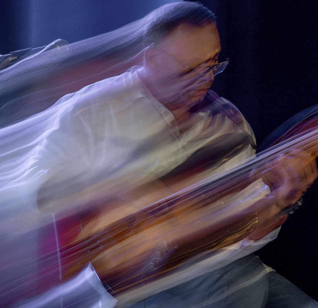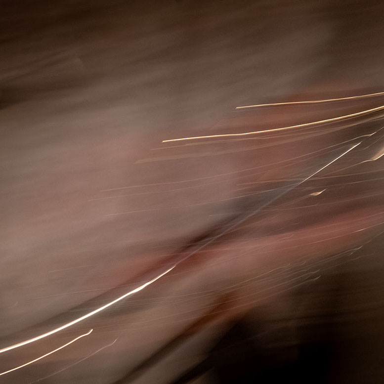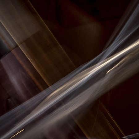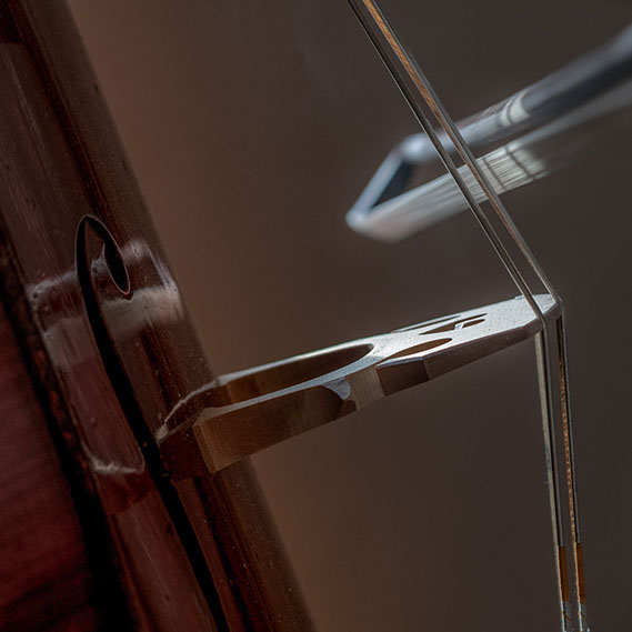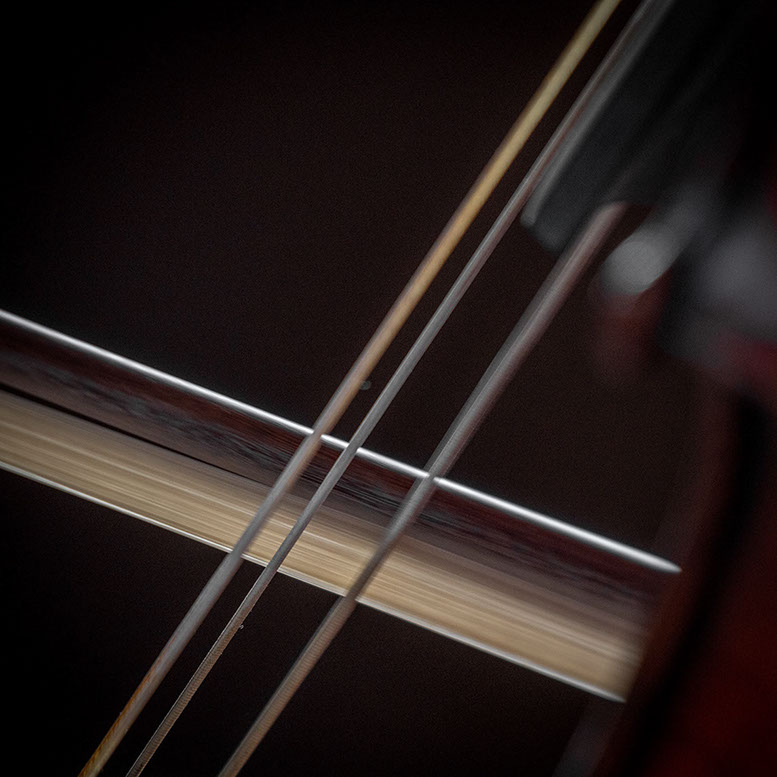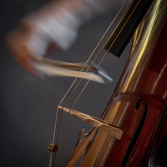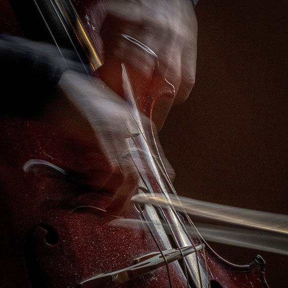 L’image est comme une déchirure où s’effondre le sol des certitudes (Georges Didi-Hubermann). On pourrait ajouter qu'elle est aussi une brèche dont une des définitions du Larousse – ouverture ou cassure produite par des fragments de matières enlevées – pourrait correspondre à cette série photographique : rendre compte autant de la matérialité du violoncelle - ses matières, ses poussières, ses écorchures, ses brillances, que du surgissement de l’inattendu, sans crier gare et comme par magie, d’une sorte d’abstraction résultant des actions et des mouvements. Des traces, des fuites, des interférences sensibles, des coïncidences improbables, des transparences, des démultiplications, des flous, des bougés, des scintillements, des flottements, des vitesses lentes, des points de netteté décalés - seuls à même de capter ces étranges apparitions : voilà le laboratoire du photographe. Les artifices techniques révèlent cette énergie où tout s’anime conjointement, bras, mains, doigts, archet, cordes, caisse de résonance.