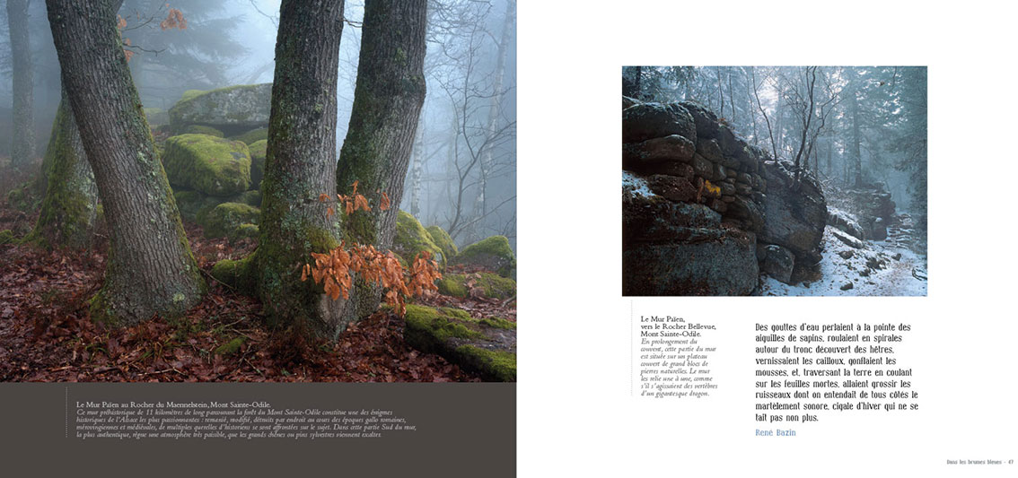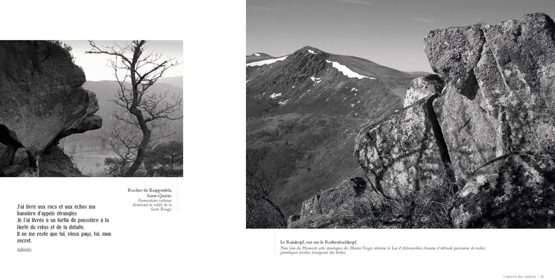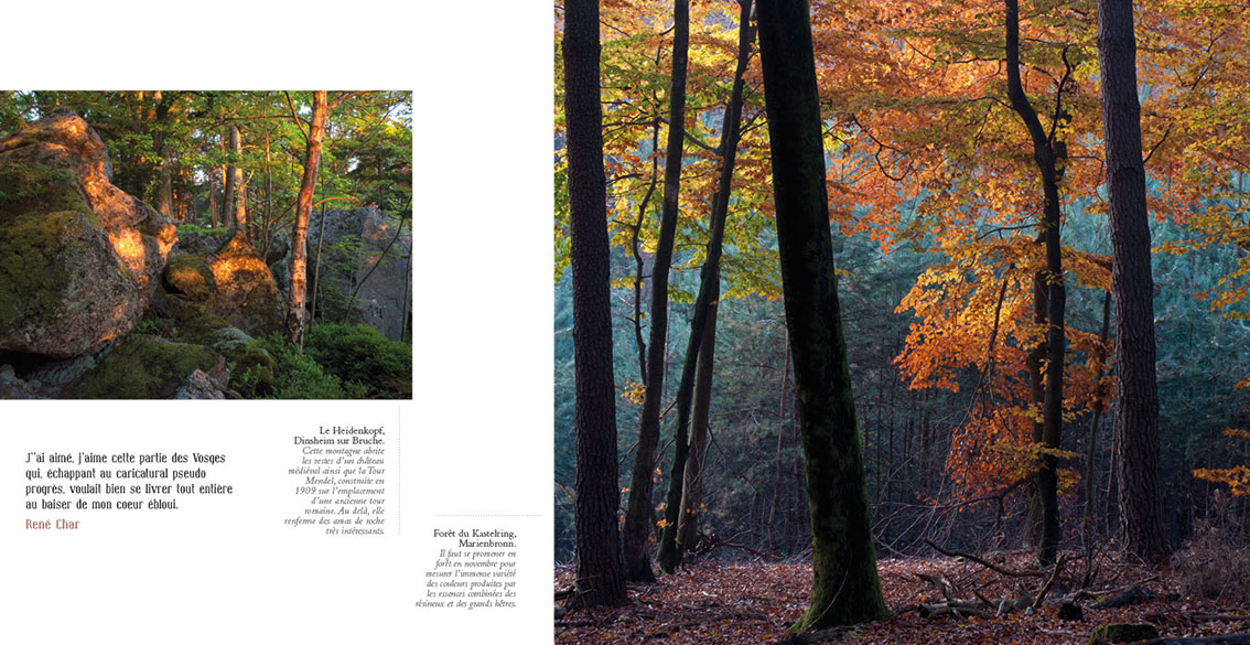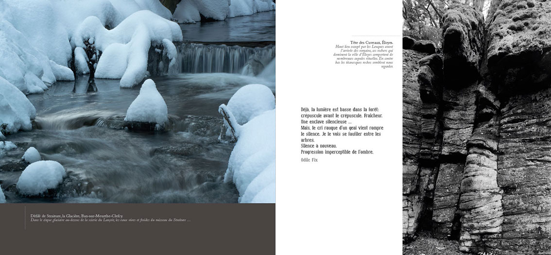 Près de 15o pages en forme d'errances inspirées, en couleurs et en noir et blanc, dans les montagnes, des roches moussues du Mur païen aux puissantes forêts du Donon, en passant par les charmantes prairies du Thillot. Au total, une centaine de lieux célèbres ou méconnus, situés en Alsace et en Lorraine, sont caressés par l'objectif de l'un et le verbe de l'autre, entre espièglerie et rêverie. Comme un appel à la randonnée.