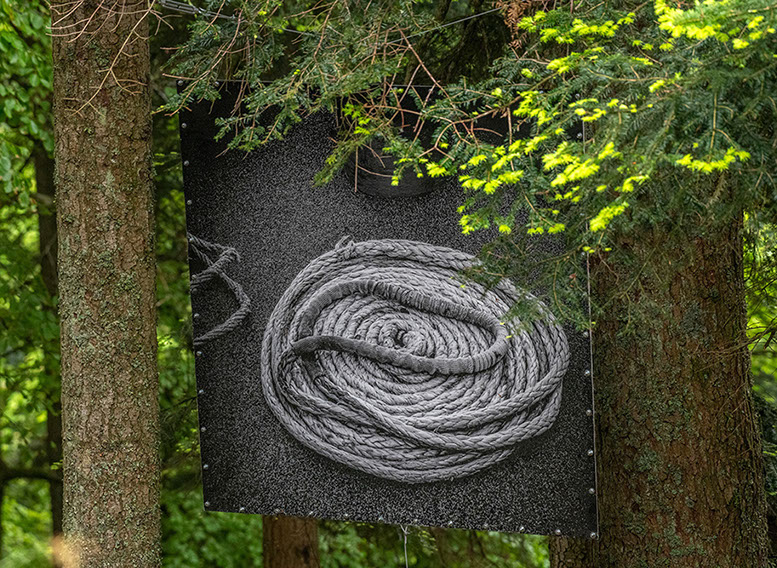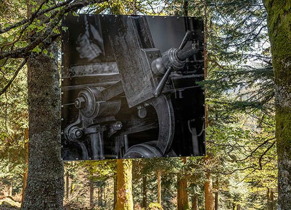 Trois duo d’images imprimées recto verso sur support bâche, câbles, métal, pièce de roulement, 150x150 cm.