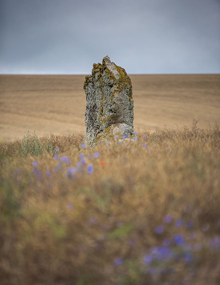 C’est une expérience non seulement artistique mais humaine et spirituelle ; je dis bien humaine et spirituelle parce que ces roches m’ont fait entendre, pour emprunter les dires de Roger Cailloix, ma « condition d’être parcellaire et rapide mais que tant de hasards ont préparé ». Autrement dit le minéral fait écho à notre condition de petits êtres éphémères et en même temps nous pousse à prendre conscience de tous les dépassements dont il nous donne l’image. Ces formations géologiques rencontrées tout le long du périple s’évaluent en millions voire en milliards d’années, dans un temps dépassant l’entendement. Elles s’associent et elles répondent aux nombreuses empreintes et utilisations des pierres par l’homme. Elles sont les objets d’une vénération toute particulière et elles exercent un pouvoir symbolique puissant dans nos esprits et nos cœurs.
