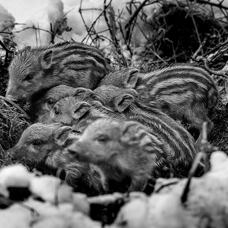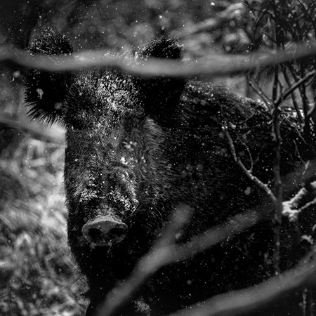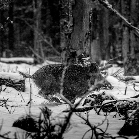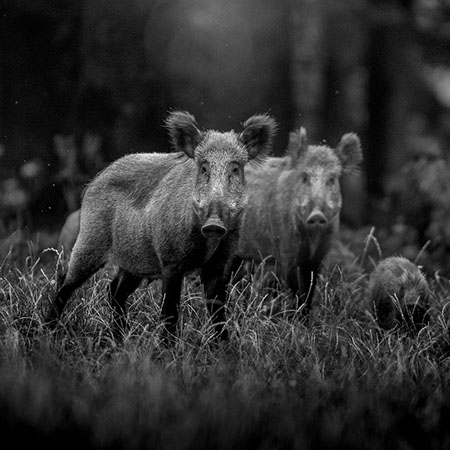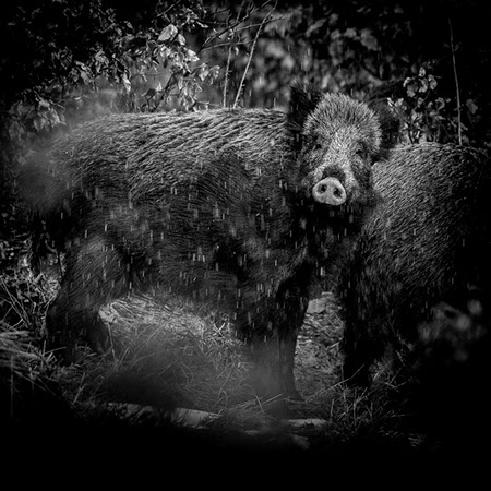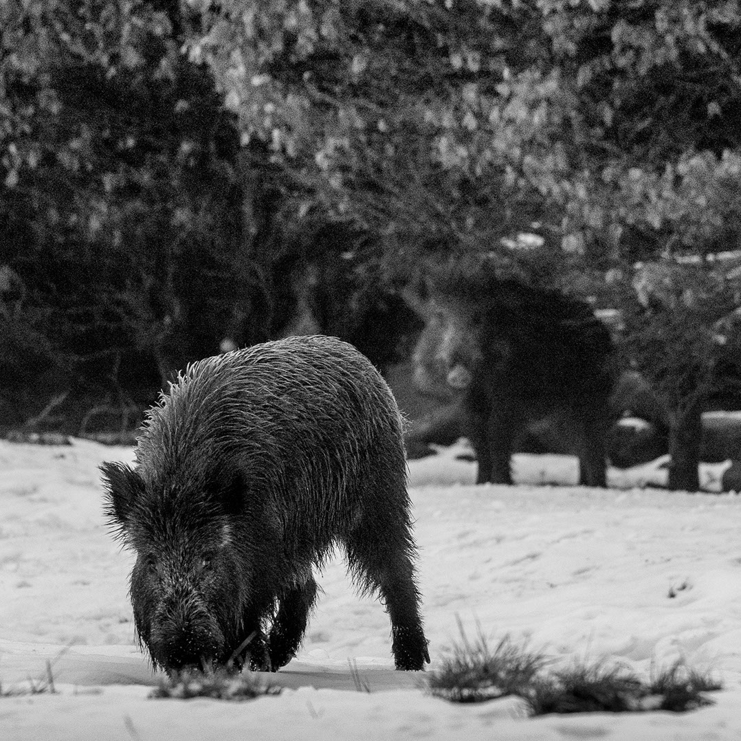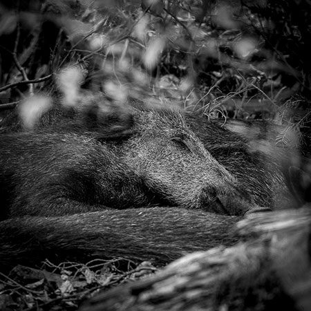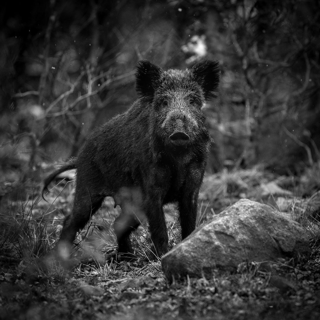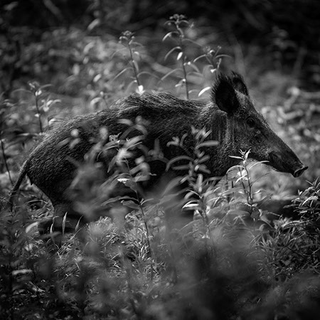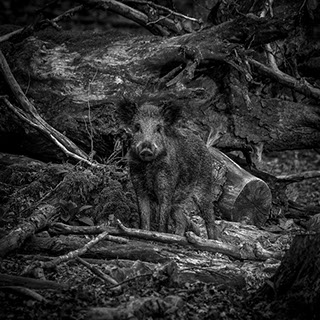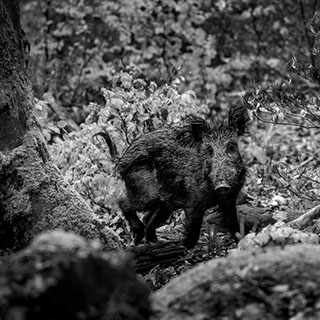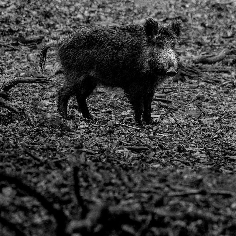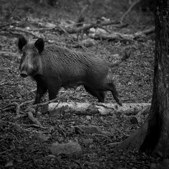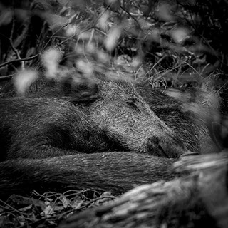 Sus scrofa est le nom latin du sanglier. Ce nom raconte bien, par sa sonorité curieuse, cet animal étrange et si proche de nous, si méprisé et si adulé en même temps. Je l’ai suivi durant deux ans, au fil de mes promenades. Il m’accompagne furtivement, apparaissant sous les taillis, surgissant, effrayé autant que moi, de sa cache secrète. Les images qui en découlent ne sont pas à proprement parler des photos animalières : je les vois plutôt comme des portraits d’animaux singuliers, saisis dans la pleine lumière du bois, attentifs aux moindres bruits, à toutes odeurs passagères. Saisir des animaux dans leur milieu est en effet une expérience totale et fugace. Elle remplit d’une joie étonnante, comme suspendue à l’instant. Derrière les textures et le grain de l’image, où poils et pelages, terres et boues, tronc et hautes herbes se répondent, j’aimerais qu’on puisse entendre aussi les grognements et les petits cris sourds de la bête, que l’on puisse sentir les odeurs terribles et douces du fauve, comprendre aussi les relations étroites que nous entretenons avec la terre, avec notre corps, avec les éléments, nous les « humus-humains » à deux jambes.