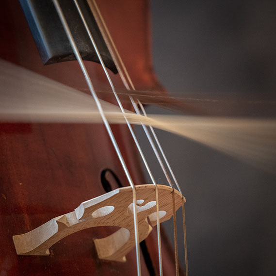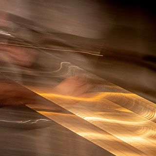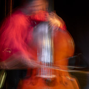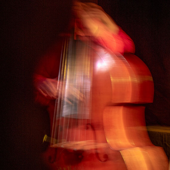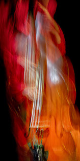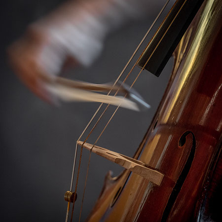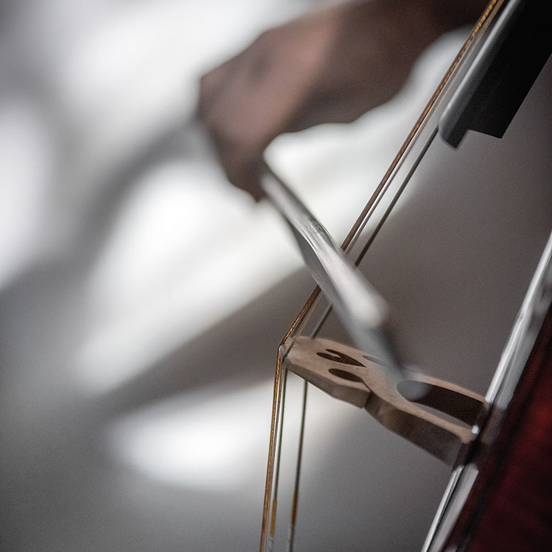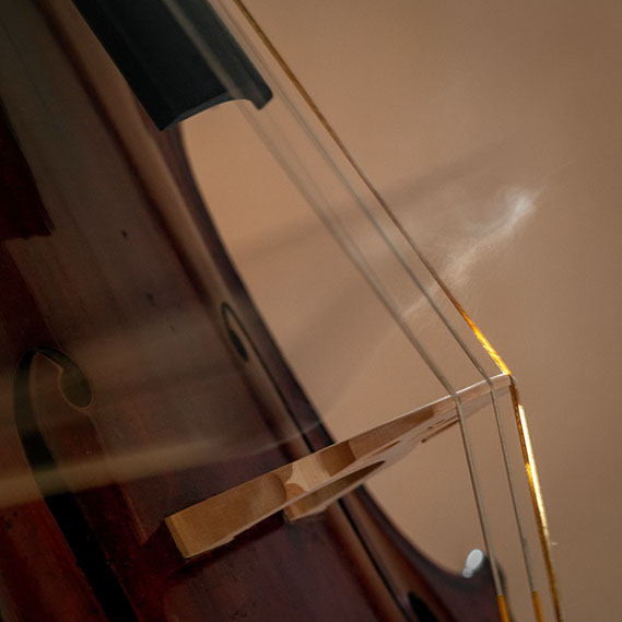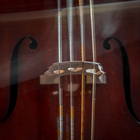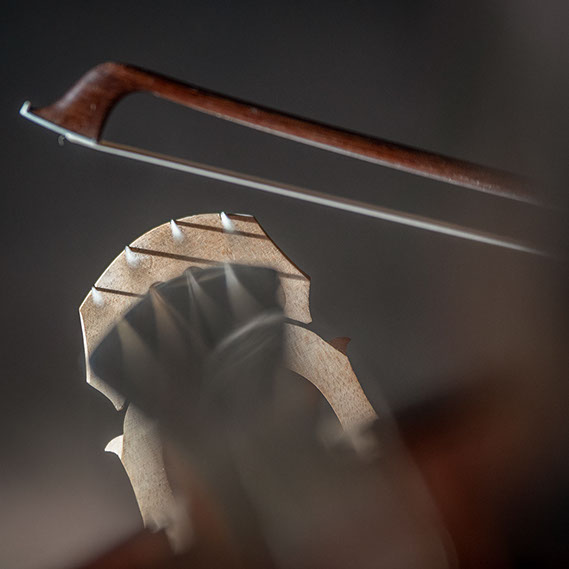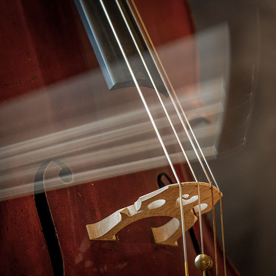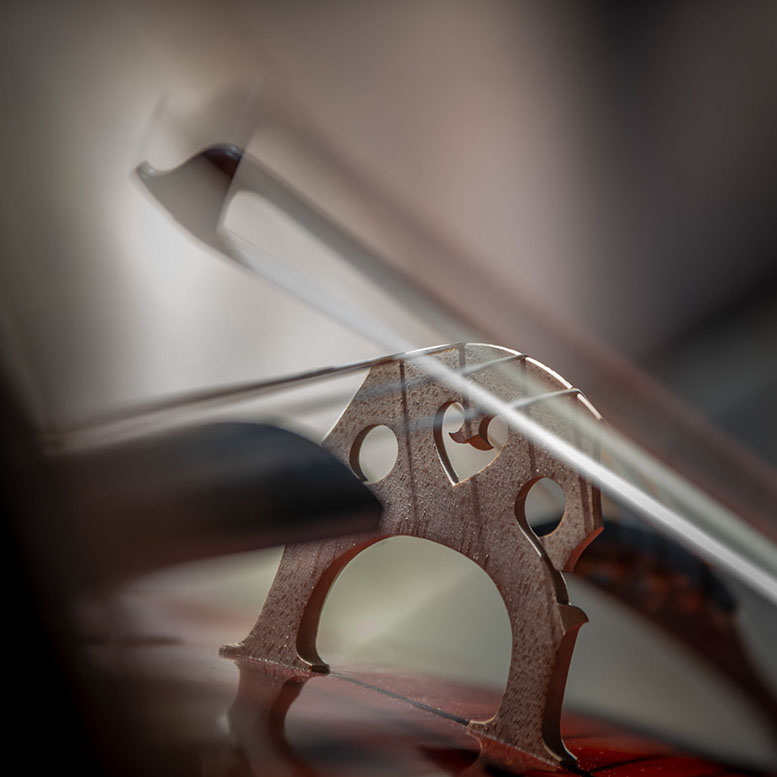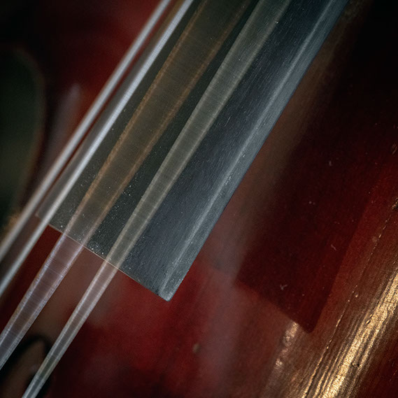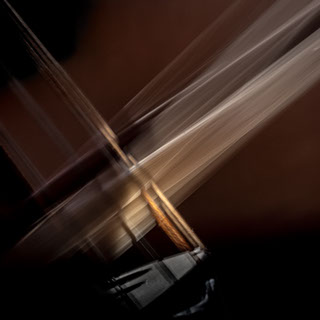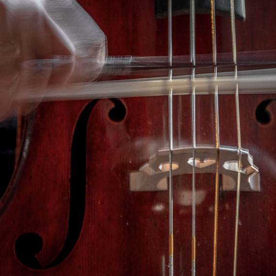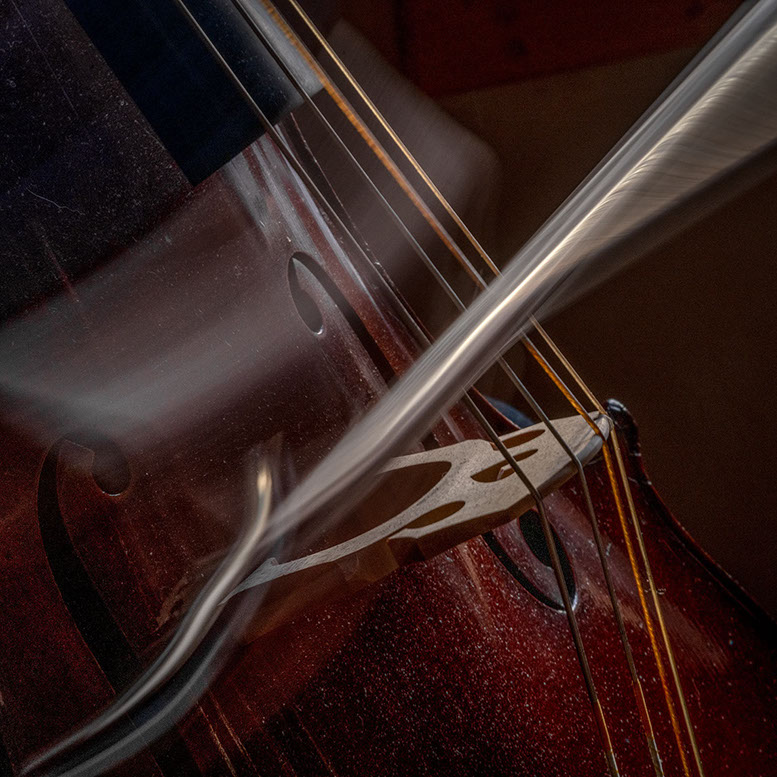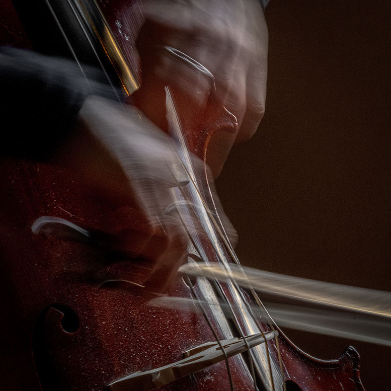 L’image est comme une déchirure où s’effondre le sol des certitudes (Georges Didi-Hubermann). On pourrait ajouter qu'elle est aussi une brèche dont une des définitions du Larousse – ouverture ou cassure produite par des fragments de matières enlevées – pourrait correspondre à cette série photographique : rendre compte autant de la matérialité du violoncelle - ses matières, ses poussières, ses écorchures, ses brillances, que du surgissement de l’inattendu, sans crier gare et comme par magie, d’une sorte d’abstraction résultant des actions et des mouvements. Des traces, des fuites, des interférences sensibles, des coïncidences improbables, des transparences, des démultiplications, des flous, des bougés, des scintillements, des flottements, des vitesses lentes, des points de netteté décalés - seuls à même de capter ces étranges apparitions : voilà le laboratoire du photographe. Les artifices techniques révèlent cette énergie où tout s’anime conjointement, bras, mains, doigts, archet, cordes, caisse de résonance.