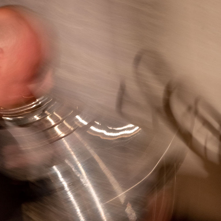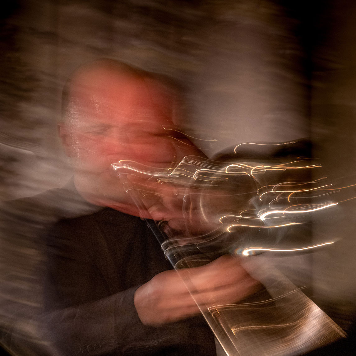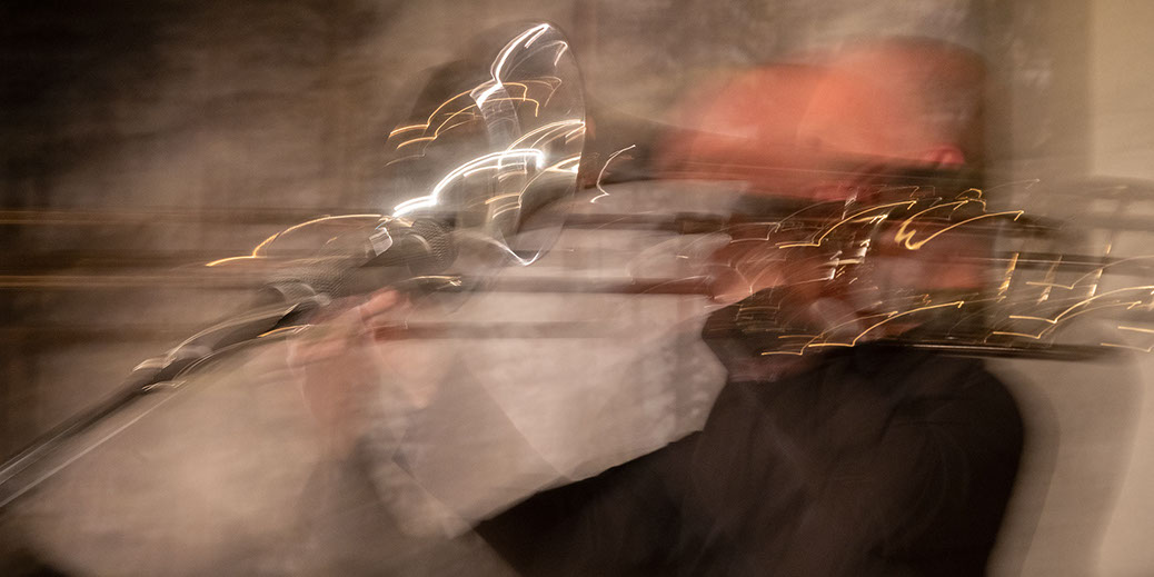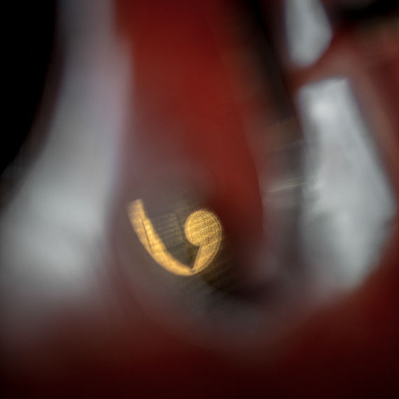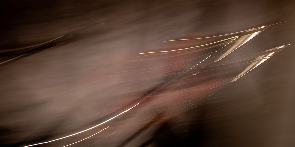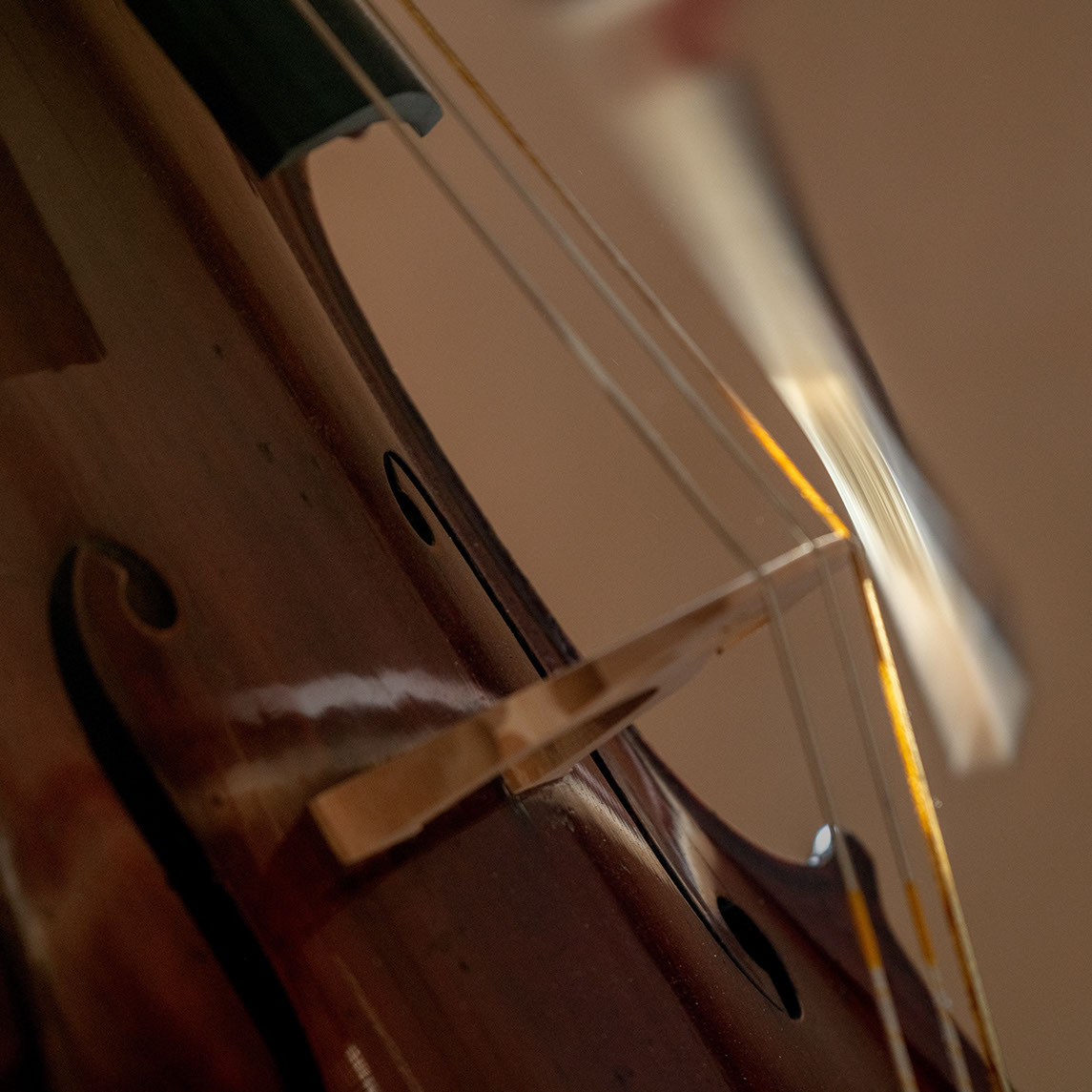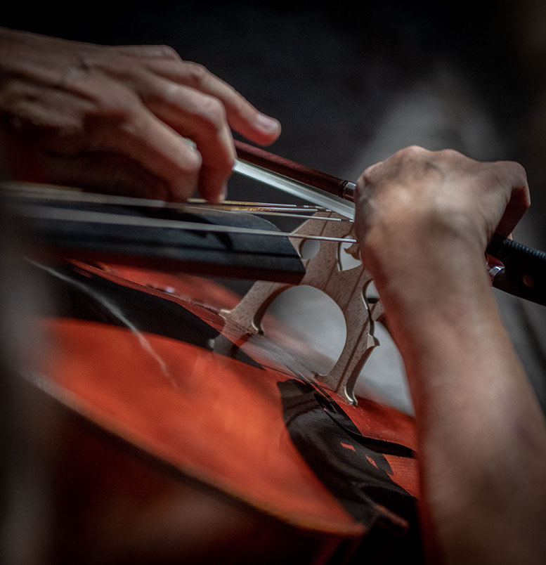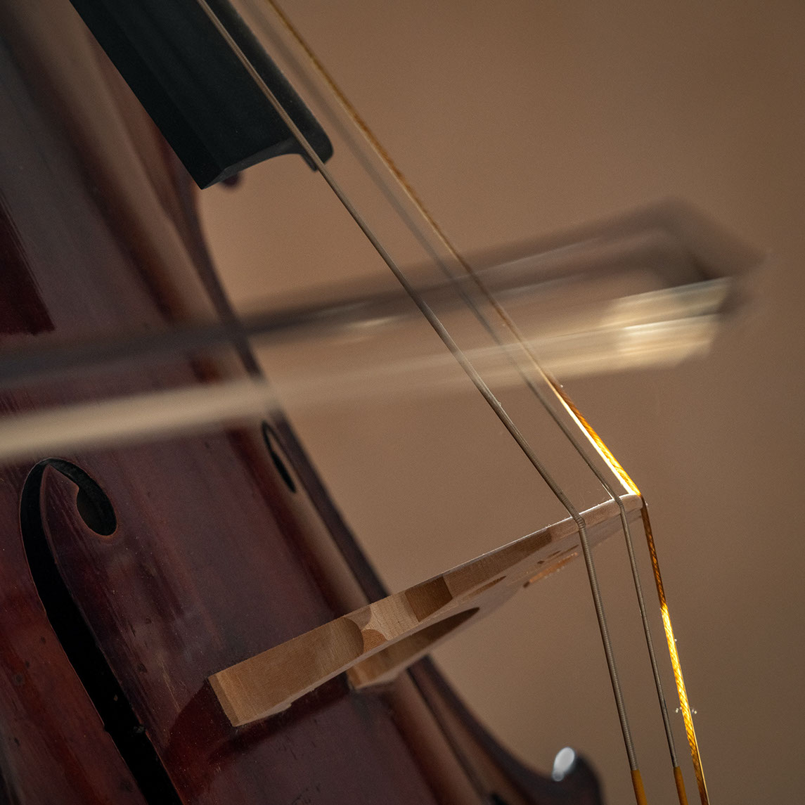 L’image est comme une déchirure où s’effondre le sol des certitudes (Georges Didi-Hubermann). On pourrait ajouter qu'elle est aussi une brèche dont une des définitions du Larousse – ouverture ou cassure produite par des fragments de matières enlevées – pourrait correspondre à cette série photographique : rendre compte autant de la matérialité du violoncelle - ses matières, ses poussières, ses écorchures, ses brillances, que du surgissement de l’inattendu, sans crier gare et comme par magie, d’une sorte d’abstraction résultant des actions et des mouvements. Des traces, des fuites, des interférences sensibles, des coïncidences improbables, des transparences, des démultiplications, des flous, des bougés, des scintillements, des flottements, des vitesses lentes, des points de netteté décalés - seuls à même de capter ces étranges apparitions : voilà le laboratoire du photographe. Les artifices techniques révèlent cette énergie où tout s’anime conjointement, bras, mains, doigts, archet, cordes, caisse de résonance.